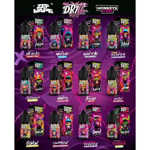 Жидкость Drill 30 мл 20 мг hard Вкусы: Грейпфрут-земляника Клубника-киви Яблочная жвачка Вишнёвая кола Манго-маракуйя Виноград-чёрная смородина Арбуз-лайм Киви-чёрная смородина Лесные ягоды Черника-малина Тропический ананас Банан-джекфрут