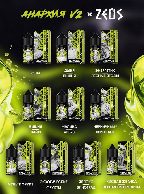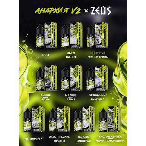 Жидкость Анархия V2 & Zeus 30 мл 20 мг hard Вкусы: Кола Дыня-вишня Энергетик лесные ягоды Вишня-лайм Малина-арбуз Черничный лимонад Мультифрукт Экзотические фрукты Яблоко-виноград Кислая жвачка чёрная смородина