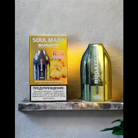 Soul Mary Bugatti - 7000 затяжек Вкусы: Ананас-холодок Виноград-холодок Клубника-ананас-кокос Малина-киви Вишнёвая кола Клубника-арбуз Манго-дыня Апельсин-холодок Киви-драгонфрут-ягоды Мята прохладная Розовый лимонад Манго-холодок Голубая малина-холодок