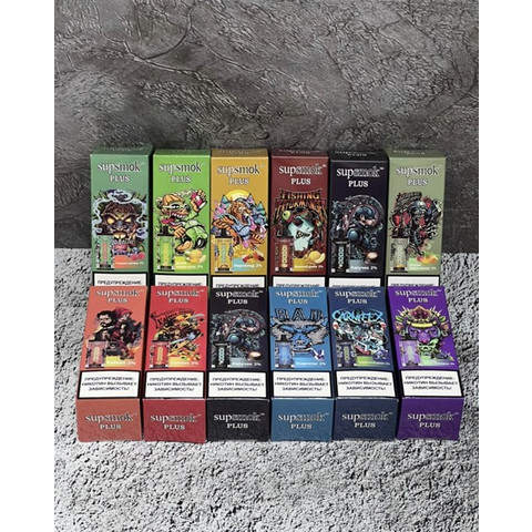Supsmok Plus - 10000 затяжек Вкусы: Кофе Капучино Клубнично-арбузная жвачка Жареная курица Энергетик Дынный джем Пина Колада Скиттлз Черничный джем Дыня-манго-алое Манго-ананас Виноград-смородина Клубничное мороженое Мармелад Арбуз-холодок Ананас Персик-м