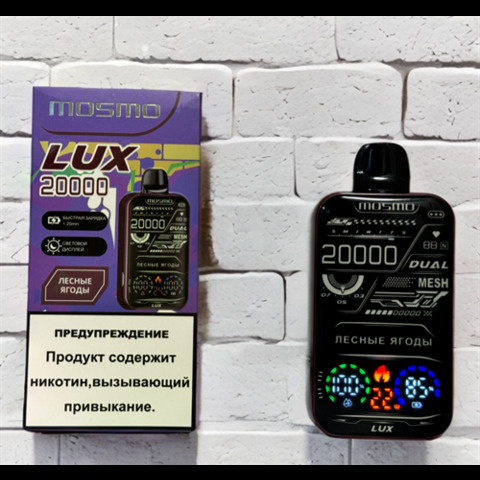 Mosmo Lux 20000 – стильный одноразовый вейп с большим ресурсом на 20000 затяжек, удобным форм-фактором и яркими вкусами для ценителей качественного парения.