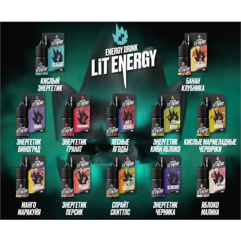 Жидкость Lit Energy 30 мл 20 мг hard Вкусы: Клубника-банан Персик Яблоко-малина Гранат Спрайт скитлс Киви-яблоко Манго-маракуйя Черника Виноград Лесные ягоды Кислые мармеладки Классический