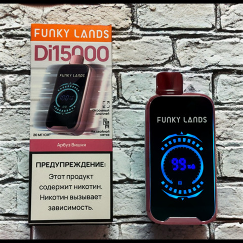 Funky Lands Di 15000 затяжек Вкусы: Черника-роза-мята Вишня-лайм Арбуз-вишня Арбуз-холодок Черника-кислая малина Виноградный энергетик Зелёное яблоко-маракуйя-киви Клубника-вишня Чёрная смородина-виноград-холодок Двойное яблоко-холодок Черника-вишня-клюкв