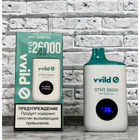 VVild Star 26000 затяжек Вкусы: Мята-спрайт Клубничное мороженое Персик Арбузная жвачка Манго Черника Банан-холодок Розовый лимонад Виноград Ананас-кокос Зелёное яблоко