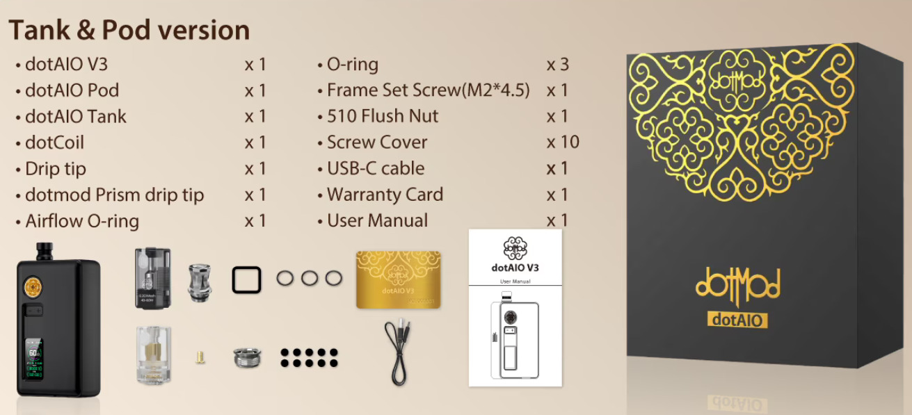 Корпус выполнен из анодированного алюминия с характерной гравировкой DotMod. Устройство поддерживает точную настройку мощности, регулировку обдува и стабильную передачу вкуса. DotAIO V3 совместим с популярными испарителями, что позволяет подобрать оптимальный стиль парения — от сигаретной тяги (MTL) до свободной (RDL).